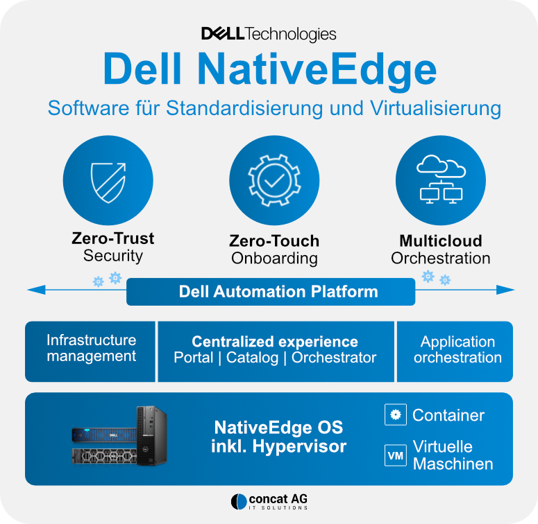 Dell NativeEdge ist eine Plattform für den Betrieb von Edge- und verteilten Infrastrukturen. Sie unterstützt die zentrale Bereitstellung, Orchestrierung und Verwaltung von Infrastruktur und Anwendungen über viele Standorte hinweg.